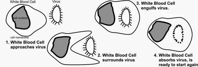 Tidak mau ketinggalan juga sel darah putih yang merupakan sel balatentara tubuh menyerang agen asing tersebut dengan jumlah yang banyak. Pada kondisi ini sel darah putih meningkat bahkan meningkat tajam dari normalnya. Sel darah putih memakan semua agen asing itu dan meninggalkannya. Sebagai tentara mereka juga dapat mati kewalahan menghadapi musuh yang masuk dalam tubuh itu. Proses ini berlangsung beberapa hari sampai mingguan bila tidak segera ditangani.